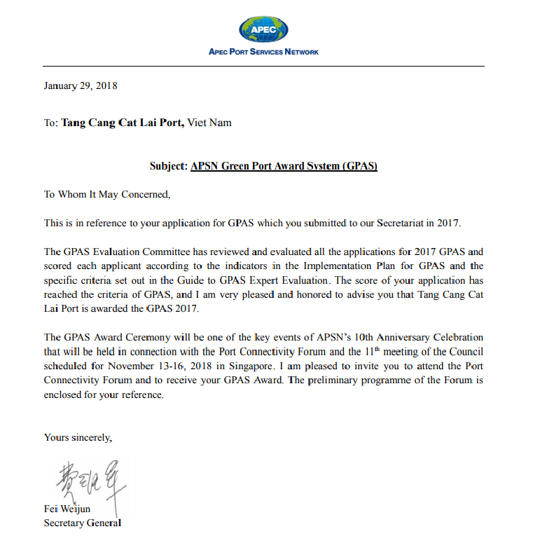 Ngày 29.1.2018, Hội đồng Mạng lưới Dịch vụ Cảng APEC (APSN) đã gửi thư thông báo cho Tổng Công ty Tân Cảng Sài Gòn (TCSG) về việc Cảng Tân Cảng Cát Lái thuộc TCSG đã được Hội đồng bình chọn đạt Giải thưởng Cảng Xanh của APEC vì đã đạt các tiêu chí của Chương trình Hệ thống Cảng Xanh (GPAS) sau khi Hội đồng xem xét Hồ sơ tham dự giải trong năm 2017 của TCSG đối với Cảng Tân cảng- Cát Lái.