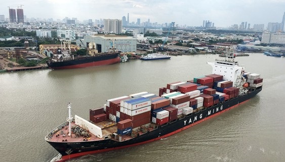 Tàu vận chuyển hàng hóa ra khỏi TPHCM trên sông Sài Gòn. Ảnh: CAO THĂNG