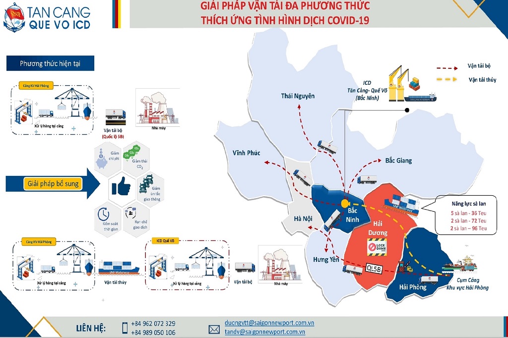 Những khó khăn này đã buộc các doanh nghiệp phải hướng đến việc tìm kiếm giải pháp vận tải thay thế – vận tải thủy nội địa, tận dụng lợi thế tự nhiên từ tuyến sông Cấm – sông Kinh Thầy – sông Đuống và hệ thống cảng sông tại khu vực Bắc Ninh đang được chú trọng phát triển như ICD Tân Cảng Quế Võ, cảng Tri Phương… tạo mô hình hub and spoke (trục bánh xe và nan hoa) để thuận lợi cho trung chuyển hàng hóa, đảm bảo được sự liên tục của chuỗi sản xuất và cung ứng.