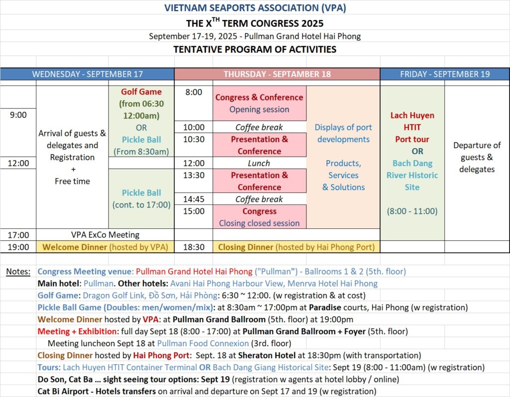 The Xth Congress of Vietnam Seaports Association (VPA) (the Event) is scheduled to be held at Pullman Grand Hotel Hai Phong on September 17-19, 2025, hosted by Hai Phong Port.